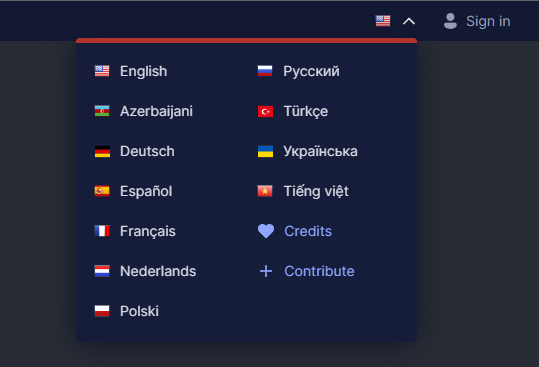 Note that both, `credits` and `contribute` links are optional. If you don't specify one or both, such options won't show in the language selector widget.